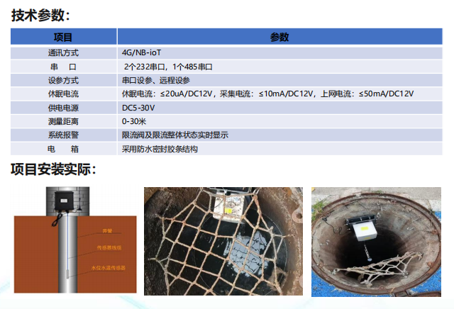 管网液位检测远传用于管网液位的检测,并将检测的数据上传平台,通过多点位的数据可以进行系 统分析,对于液位的变化进行记录, 并通过趋势分析进行液位变化预警, 为调度污水管理提供了决策依 据。更好的辅助管理,实现管道污水的精准管理。系统采用4G通讯网络,通过4G网络上网登录 INTERNET网络平台传输数据,只要有4G网络的地方就可以传输数据。